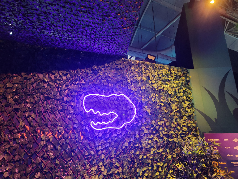 쥐라기 바다 구역도 공룡의 얼굴 모양의 네온 사인이 관람객을 맞이하고 있었어요.