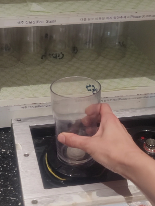 생맥주 잔을 바닥에 있는 홈에 끼우면 이렇게 아래에서부터 맥주가 차오르기 시작합니다.
