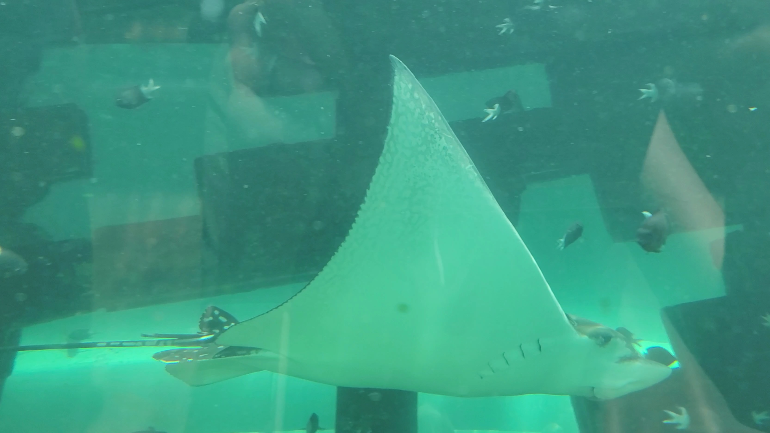 스팅레이가 헤엄치면서 입에서 떨어진 물고기의 살이 수조 안을 떠다니고 있었습니다.