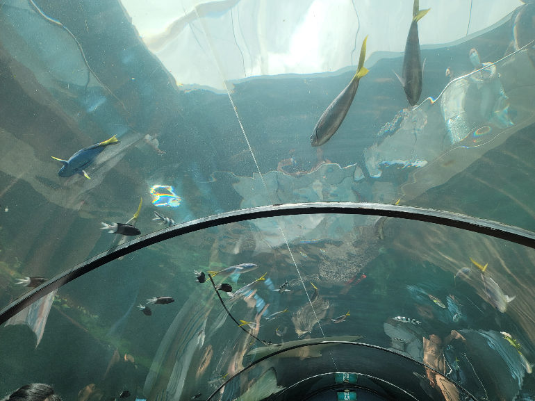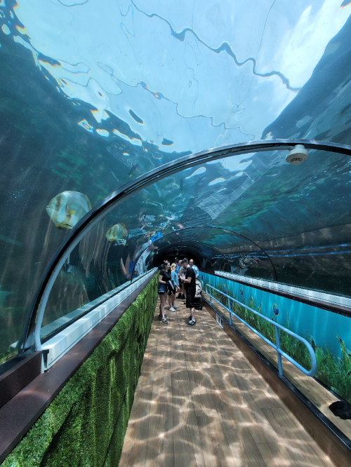 터널의 좌우와 위는 거대한 수족관이어서 터널 옆을 헤엄치는 해양 생물들을 아주 가까이서 볼 수 있습니다.