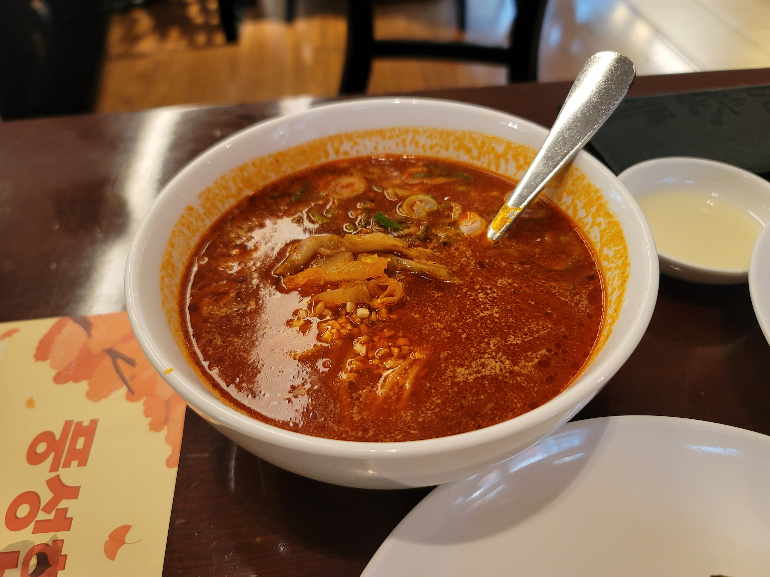 얼큰한 탄탄면, 면 위에 뿌려진 참깨와 땅콩이 얼큰함에 고소한 맛을 더합니다.