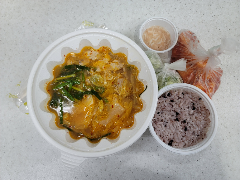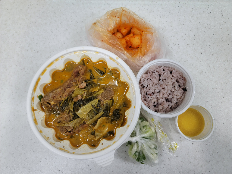 뼈해장국을 주문했을 때와 동일하게 파와 김치, 밥 한공기가 포함되었고 수육을 찍어먹을 새우젓도 함께 포장되었어요.