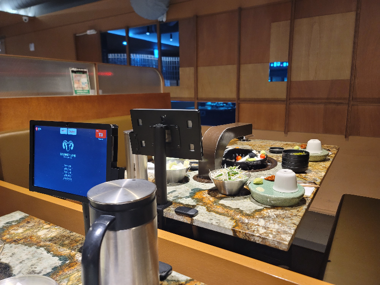 각 테이블에는 태블릿이 놓여 있어서 간편하게 메뉴 주문을 할 수 있습니다.