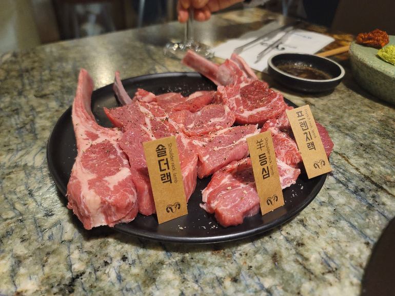 고메램의 시그니처 양갈비 3종인 숄더랙과 생등심, 프렌치랙이 포함되어 있습니다.